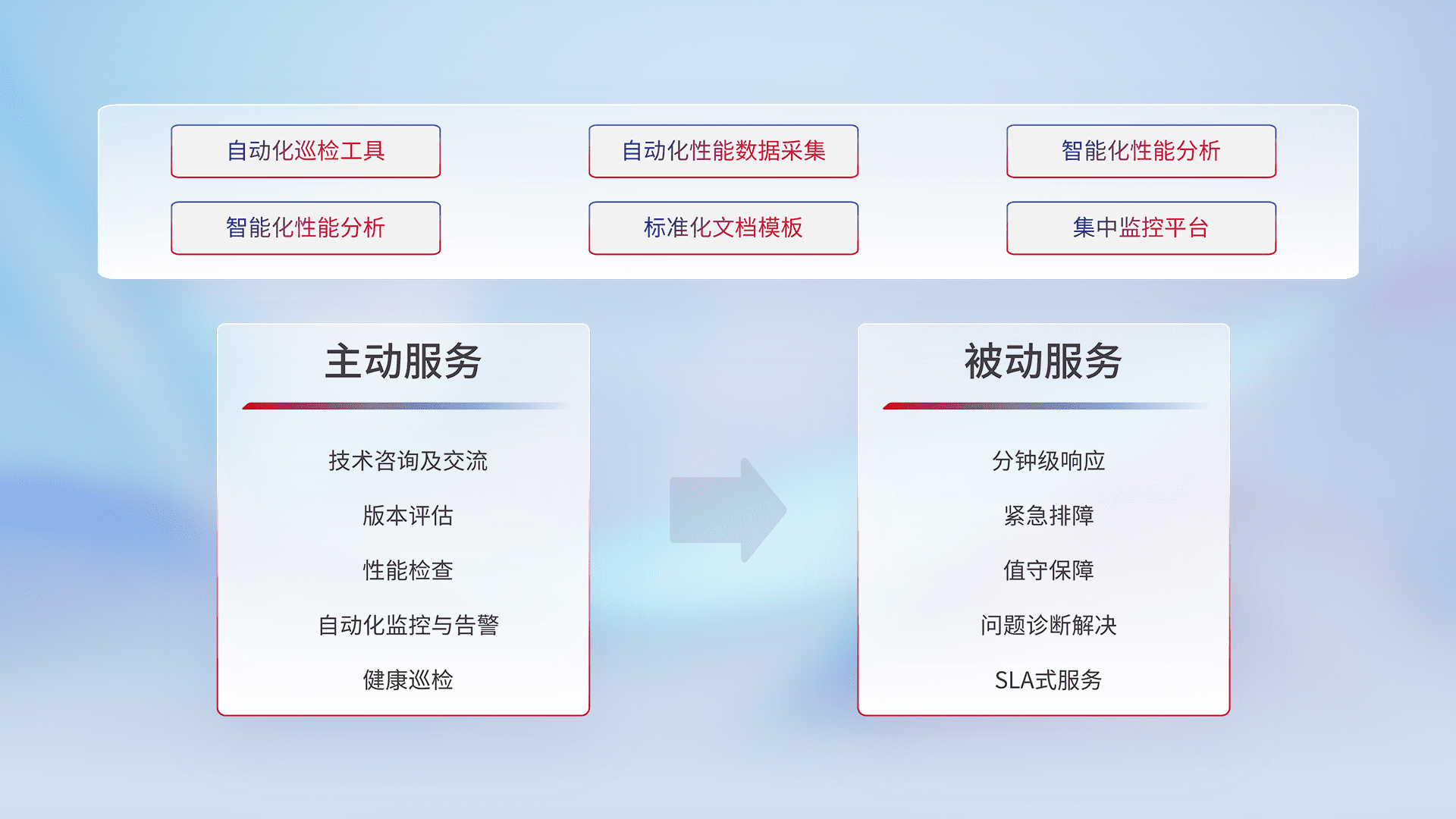智能化工具和标准化文档,,,,保障服务质量,,提供主动服务(包含技术咨询、、版本评估、、、性能检查、、、、自动化监控与告警、、健康巡检)和被动服务包含(分钟级响应、、紧急排障、、值守保障、、、问题诊断解决、、、SLA服务)。。。。